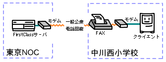 最初に始まったのは、学校から東京NOC(Network Operation Center)のFirstClassの電子会議室(メディアキッズ)ホストへ普通のパソコン通信と同じようにアクセスすることであった。この頃は最小限のパソコン1台とモデム1台の構成である。まだ専用の電話回線はなく、学校のファックス回線を間借りするかたちで行われていた。中川西小学校がメディアキッズに加入した、といっても、IDが用意されていたのは中川先生だけで、他の人がアクセスしようと思ってもできない。また、アナログのモデムで東京まで市外電話をかけていたため、しばしば途中で途切れてしまったり、東京NOC側が混んでいてつながらないこともあった。